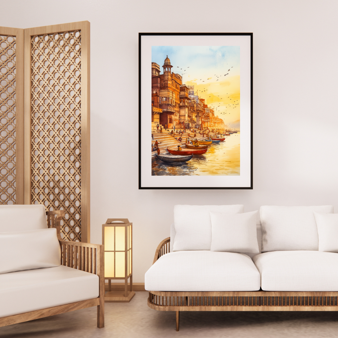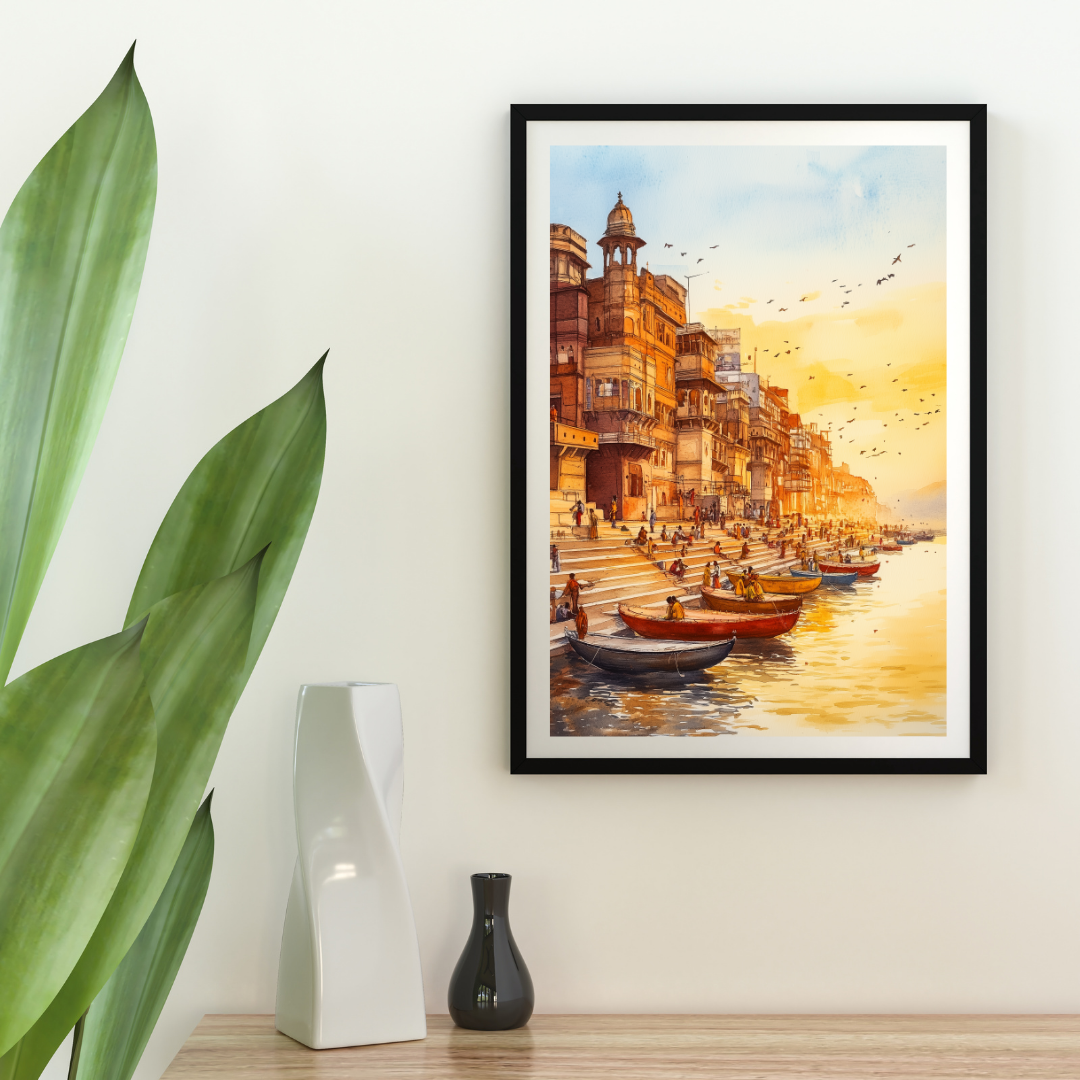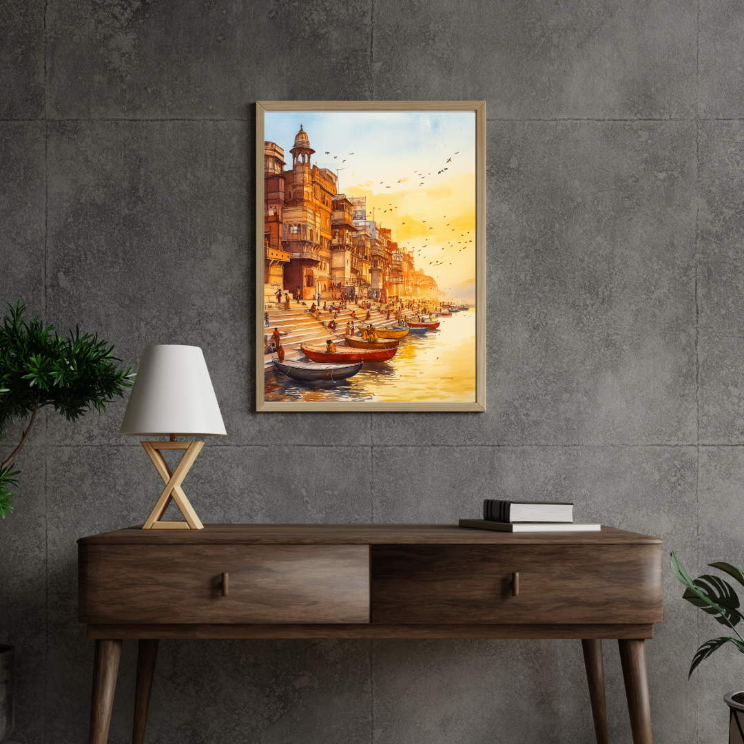Ganga captures the peaceful banks of the Ganges River during a serene sunset. The warm colors, reflections on the water, and distant silhouettes evoke the spiritual significance of the river in Indian culture. Imagine sitting on the steps, watching the river flow, surrounded by the energy of life and devotion. This artwork is perfect for those who seek a spiritual and calming presence in their home.