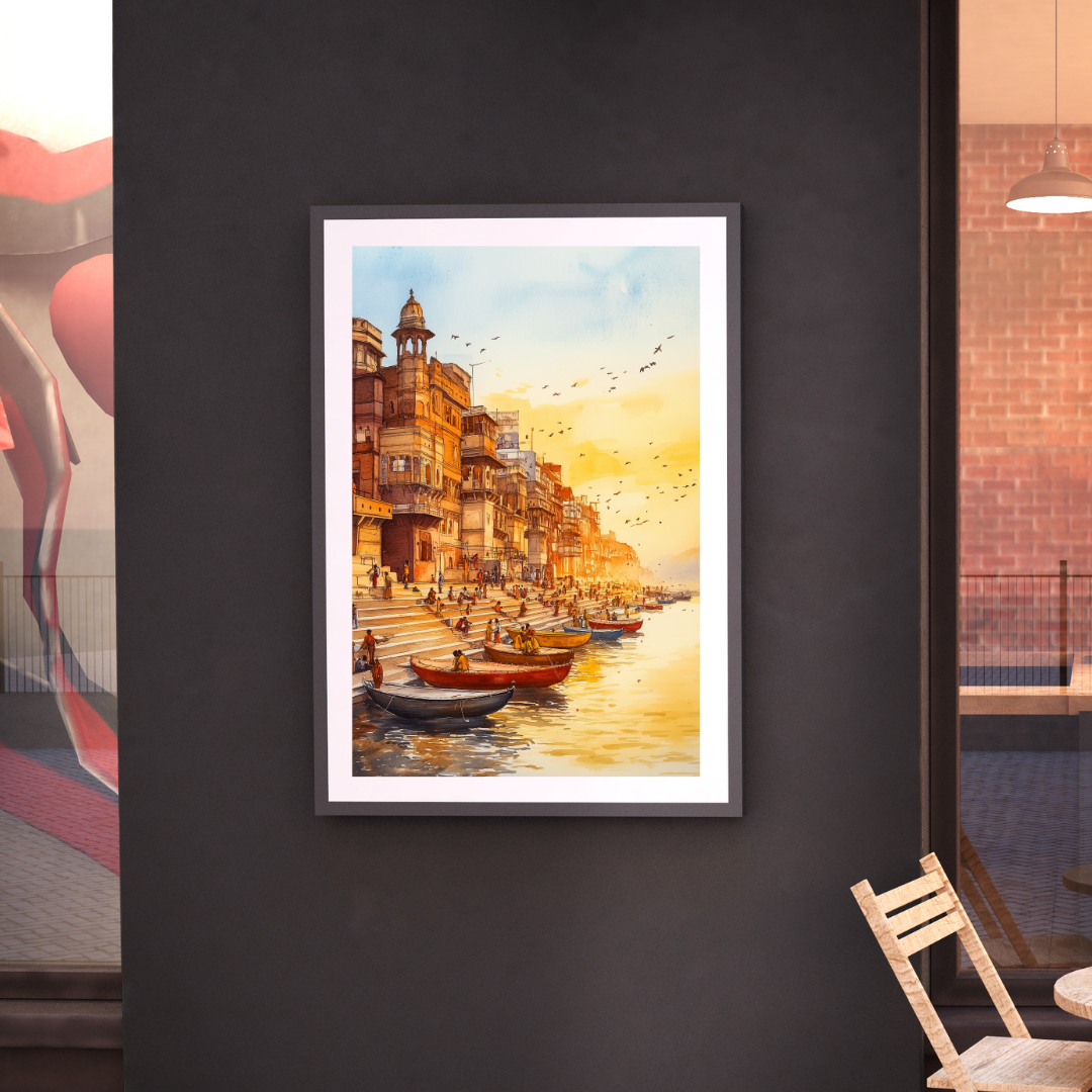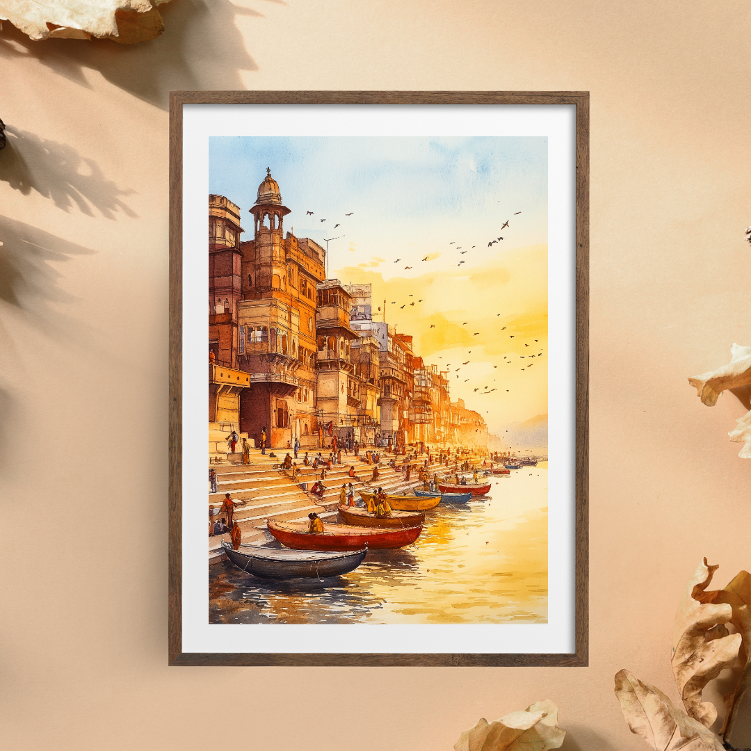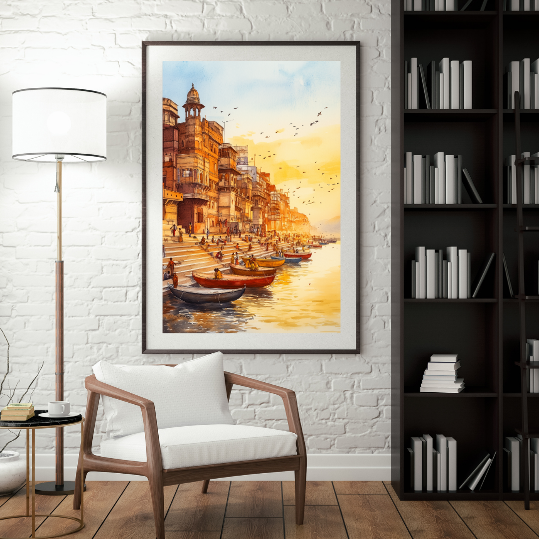Ganga captures the peaceful banks of the Ganges River during a serene sunset. The warm colors, reflections on the water, and distant silhouettes evoke the spiritual significance of the river in Indian culture. Imagine sitting on the steps, watching the river flow, surrounded by the energy of life and devotion. This artwork is perfect for those who seek a spiritual and calming presence in their home.