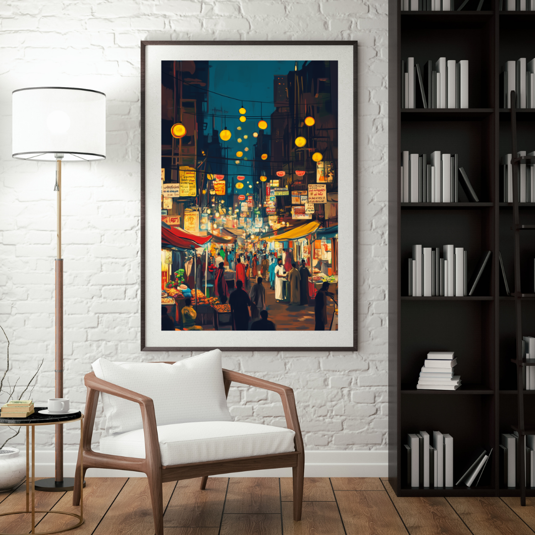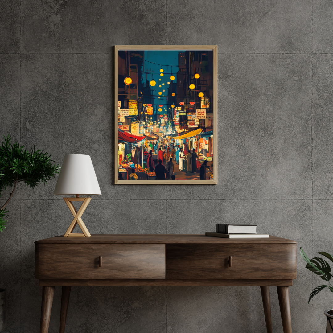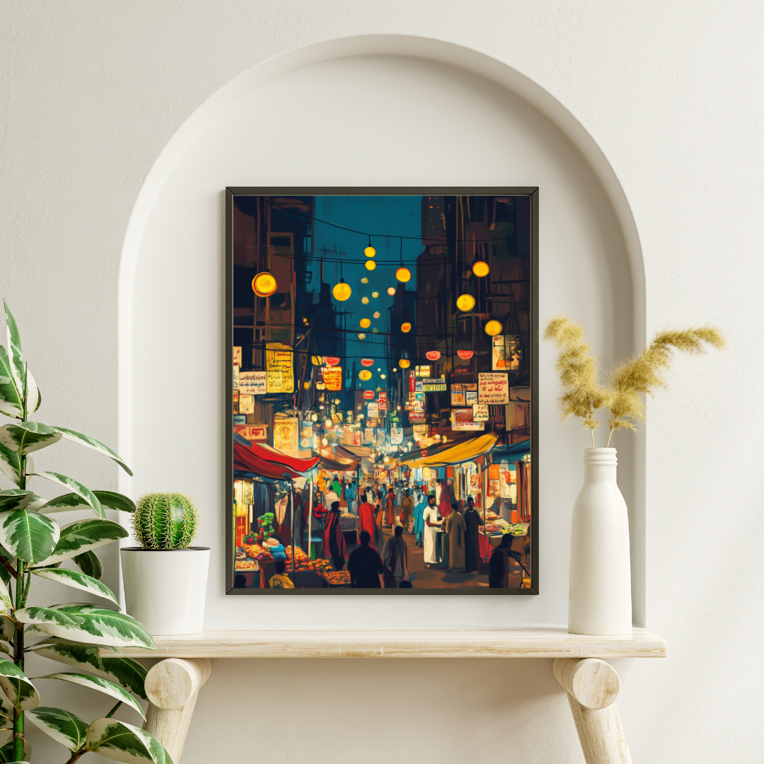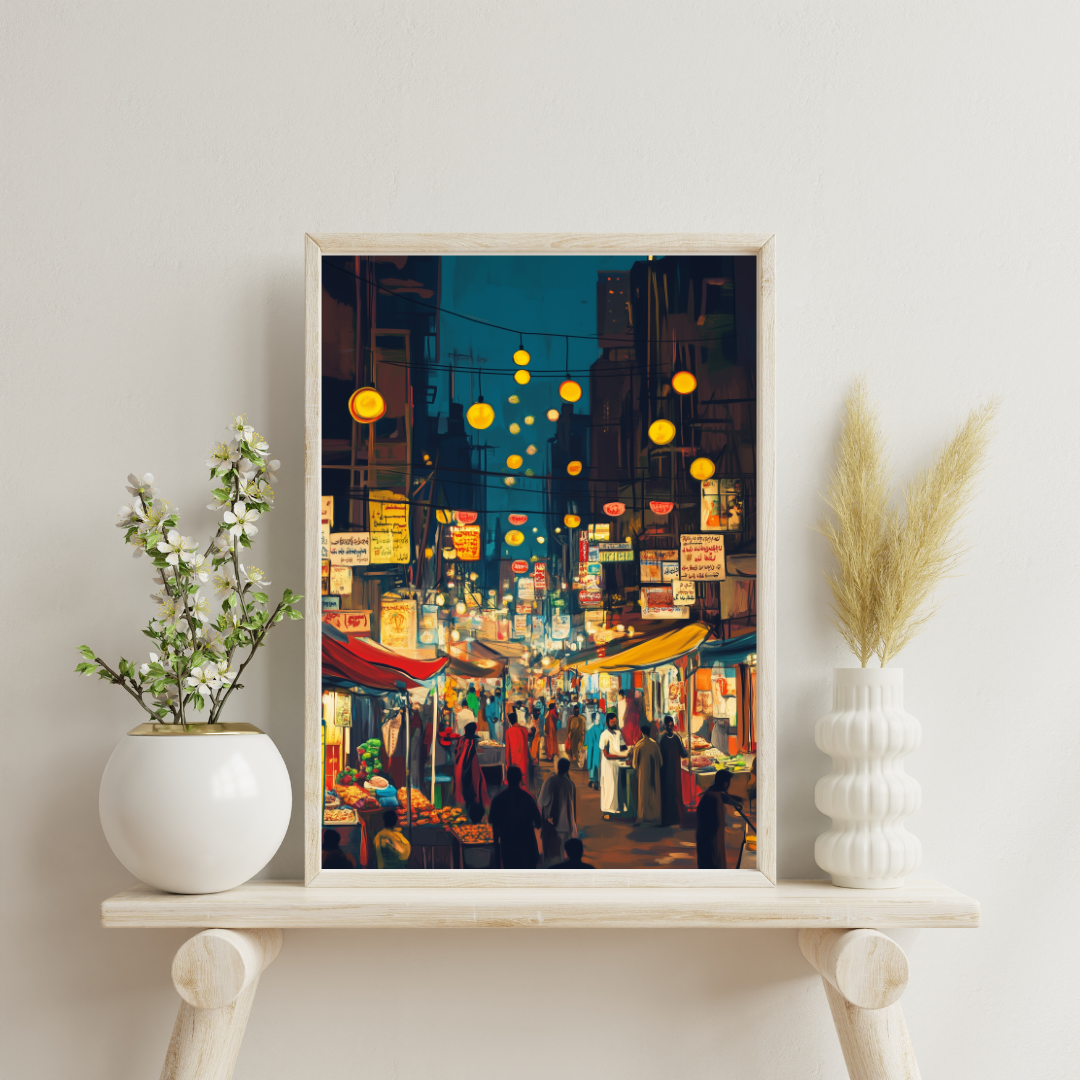 Karachi ki Ronaq captures the vibrant atmosphere of a bustling night market in Karachi, filled with colorful lights, signs, and lively crowds. The energy of the scene evokes a sense of cultural celebration and the charm of city life. Perfect for those who love urban culture and vibrant artwork.
