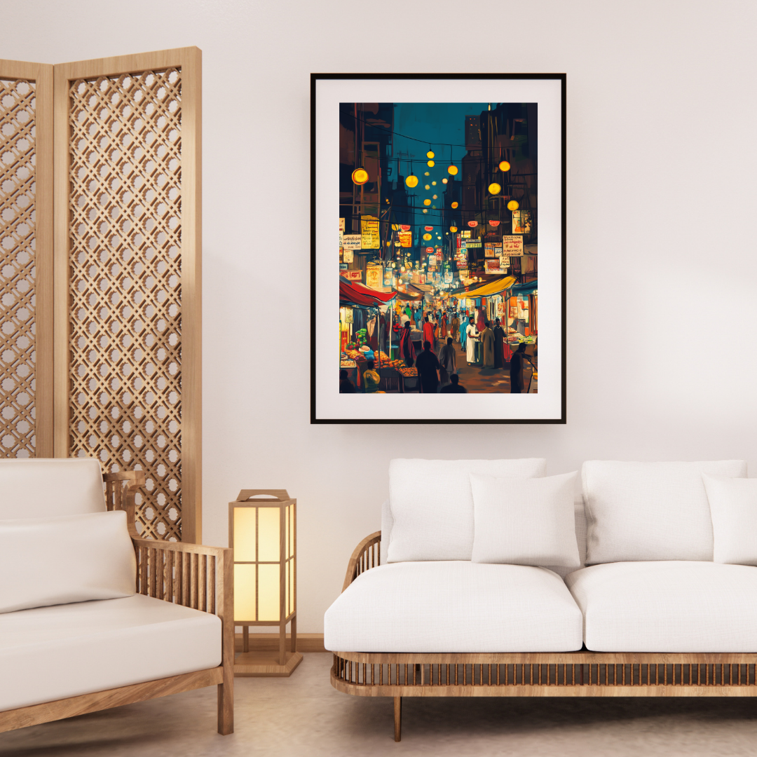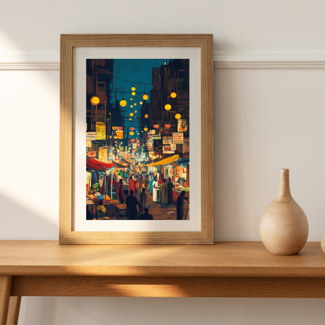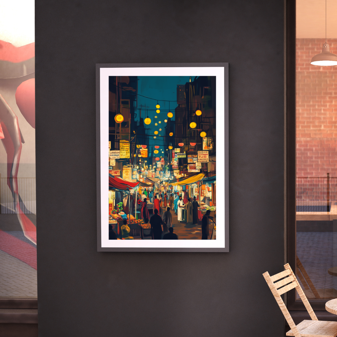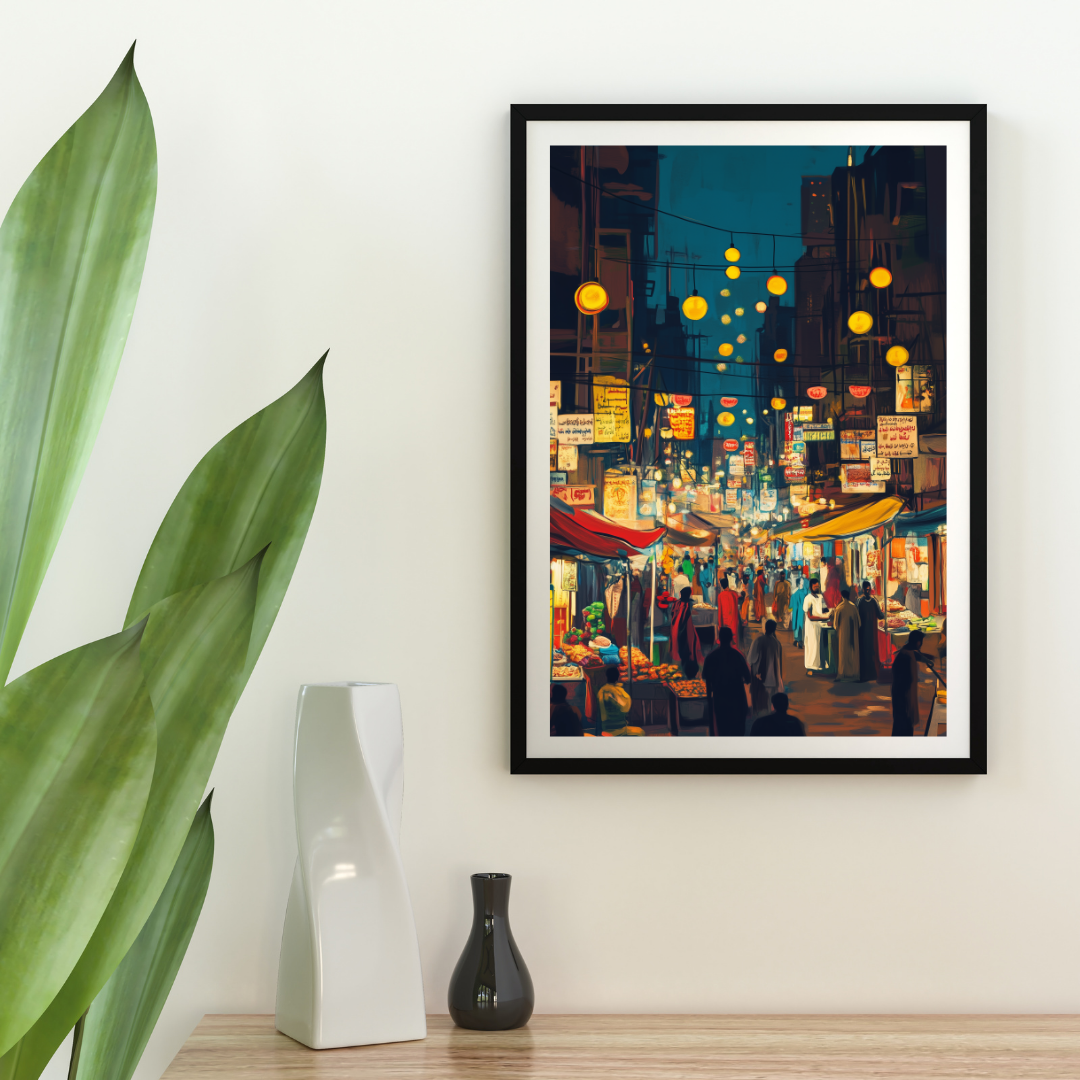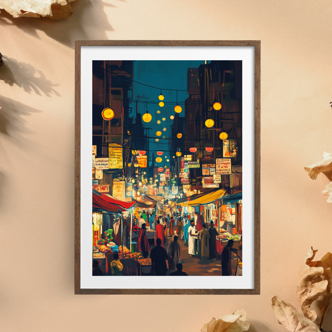 Karachi ki Ronaq captures the vibrant atmosphere of a bustling night market in Karachi, filled with colorful lights, signs, and lively crowds. The energy of the scene evokes a sense of cultural celebration and the charm of city life. Perfect for those who love urban culture and vibrant artwork.